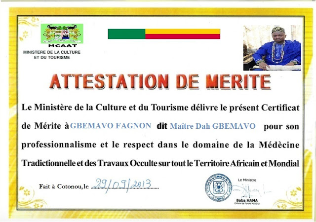 Médium DAH GBEMAVO, est nanti d'un master en gestion de projets. Son attachement a la tradition et sa grande connaissance très étendue de la vertu des plantes l'amènent a créer en 1990 le cabinet de voyance LA PAIX ou il s'occupe de la santé et des problèmes spirituels... Pendant 17 ans sa curiosité le pousse vers plusieurs maître spirituels et mages africains indiens et asiatiques,ce qui lui fit obtenir en 2006 son premier diplôme en chiromancie,une science qui fait sa renommée aujourd'hui prêtre de FA, Numérologue, Chiromancien, voyant et maître spirituel dans plusieurs ordres,il décide de partager ses connaissances avec le monde entier.Réalise un vrai et sérieux retour d'affection .Ce retour d'affection est sans risque car exécuté en magie blanche avec le magnétisme.Le retour affectif sera durable car le retour de l'être aimé ainsi retrouvé est consolidé par une union astrale pour la fidélité et la pérennité du couple reformé.